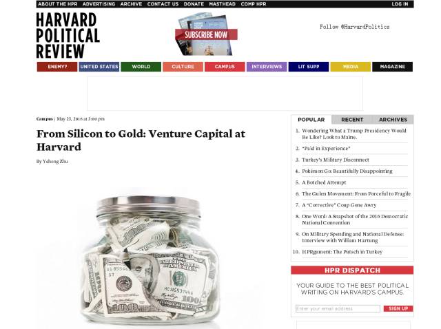 5. 给哈佛政治网站投稿。哈佛政治评论是一个无党派政治季刊杂志。当时我是从事风险投资研究,写了一篇名为《从硅到金:哈佛的风险投资》的文章。