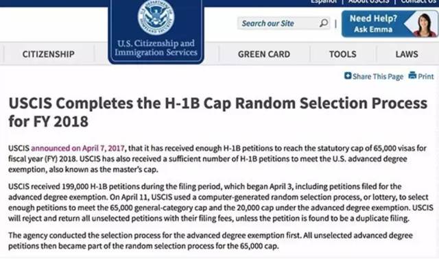 快报:4月17日USCIS(美国移民局)宣布收件期内共收到了199,000份H1B申请,并在4月11日通过电脑随机抽签的方式,完成了所有硕士及以上学位,以及学士和其他学位的85,000份抽签过程。 65,000个H-1B名额会在general-category cap中选出,剩下的20,000个名额会在master’s degree cap中选出。移民局首先在advanced degree exemption中随机抽取,没有被抽中的人会被放到general的人员中进入下一轮的抽签。 19.9万 这个数字,和去年的23.6万份H1B申请数相比,出乎意料的减少了3万余份。而这也是自从2014年以来,申请H-1B 签证的人数首次跌破200,000。 那么今年申请的同学可以如何查询申请结果呢? 1. 在官网上查支票https://egov.uscis.gov/casestatus/landing.do 2. 问学校I-20有没有被延期 3. 等receipt notice 在今年的h1b申请季开始之前,政府就宣布会密切关注今年的抽签。美国移民局宣布他们会更加仔细检阅今年申请者的信息。美国司法部门召开了记者发布会,警告那些为h1b签证者提供签证的雇主们不要歧视美国的工人。这些都是压垮外包公司的手段。 美国移民局官方是如何解释今年抽取人数下降的呢? “在这样不确定的氛围中,今年申请h1b签证的人数大幅度减少并不奇怪,” Betsy Lawrence, the director of government relations for the American Immigration Lawyers Association说道。 “一些印度的互联网公司宣布它们将会减少那些有较少从业经验的员工的h1b签证数量,这意味着这些工作将会留在印度而不是被迁去美国,” Lawrence说。 “许多雇主在过去的几年里都没有成功为员工申请到h1b签证,它们就会更加不愿意去淌这趟浑水,为需要签证的员工花额外的钱,” Lawrence补充说明道。