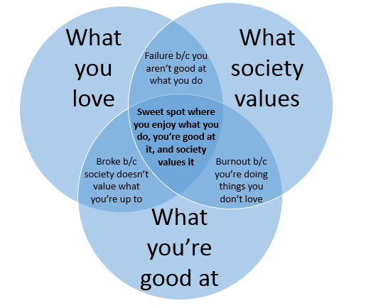 找到你的“最佳领域”。所谓的“最佳领域”,就是你热爱的、你擅长的、以及社会价值所看重的内容恰好所重叠的领域。