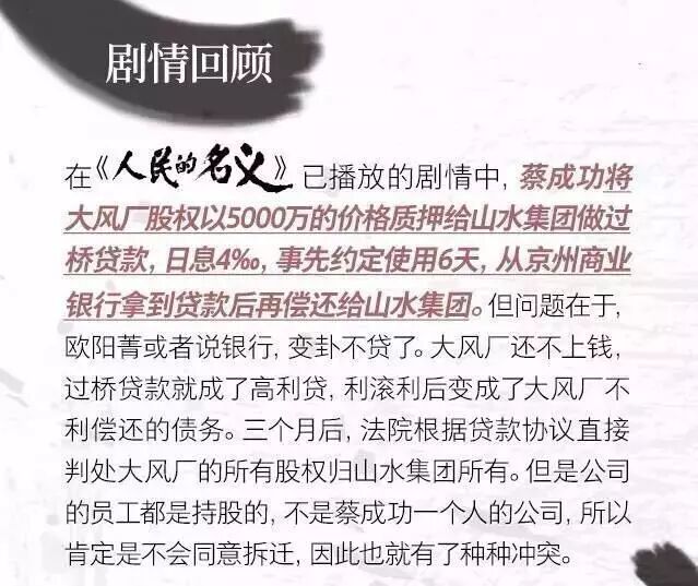 4月8日,BBC发布文章介绍中国反腐题材电视剧《人民的名义》,并称为为中国的《纸牌屋》 来源:经济日报 这部剧除了“抓贪官”,更注重挖掘由腐败带来的一系列连锁反应。由赵德汉引出丁义珍,由丁义珍引出光明峰项目中存在的问题,比如大风服饰厂和山水集团的股权纠纷,大风服饰厂的地皮拆迁问题。 剧情虽然不算复杂,但却涉及到了许多金融、经济知识,今天,就为大家复盘和解析其中涉及到知识。