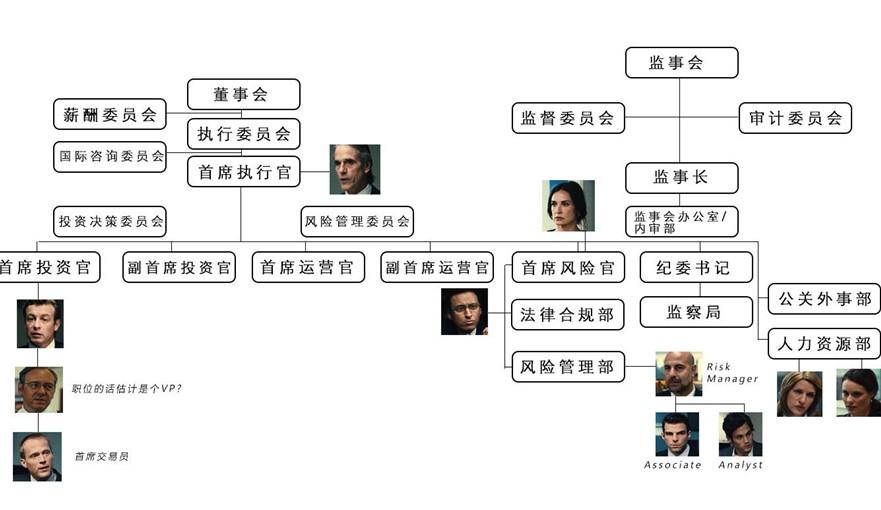 有热心网友运用高盛的组织架构,对应片中的人物,制成了下面这张关系图,有一定参考价值。