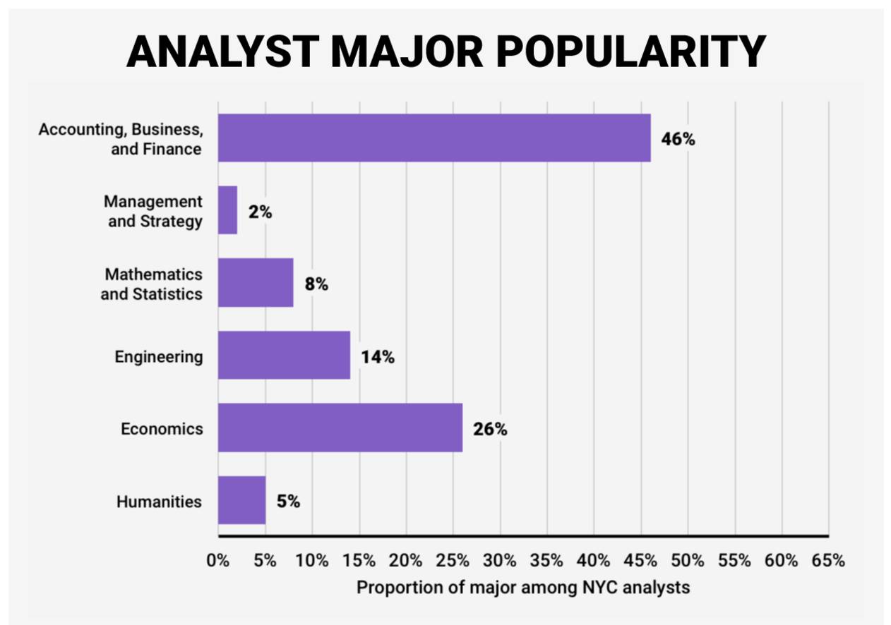 对于在华尔街工作的分析师而言,大部分来自于会计、商业、金融以及管理专业,而22%的分析师是数学、统计、工程学专业,甚至这些STEM专业毕业的人多于经济学毕业的人。