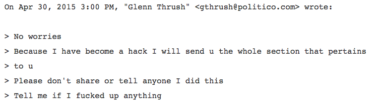 在爆料中,一封来自Politico首席通讯记者Glenn Thrush的邮件格外惹眼。他在与Podesta的邮件往来中显现了十足的低声下气的姿态。他在一封邮件中自称“Hack”(小报写手),愿意为希拉里鞍前马后;还特别小心翼翼地请示工作,询问自己是否搞砸了任何事情(Tell me if I fucked up anythig)。